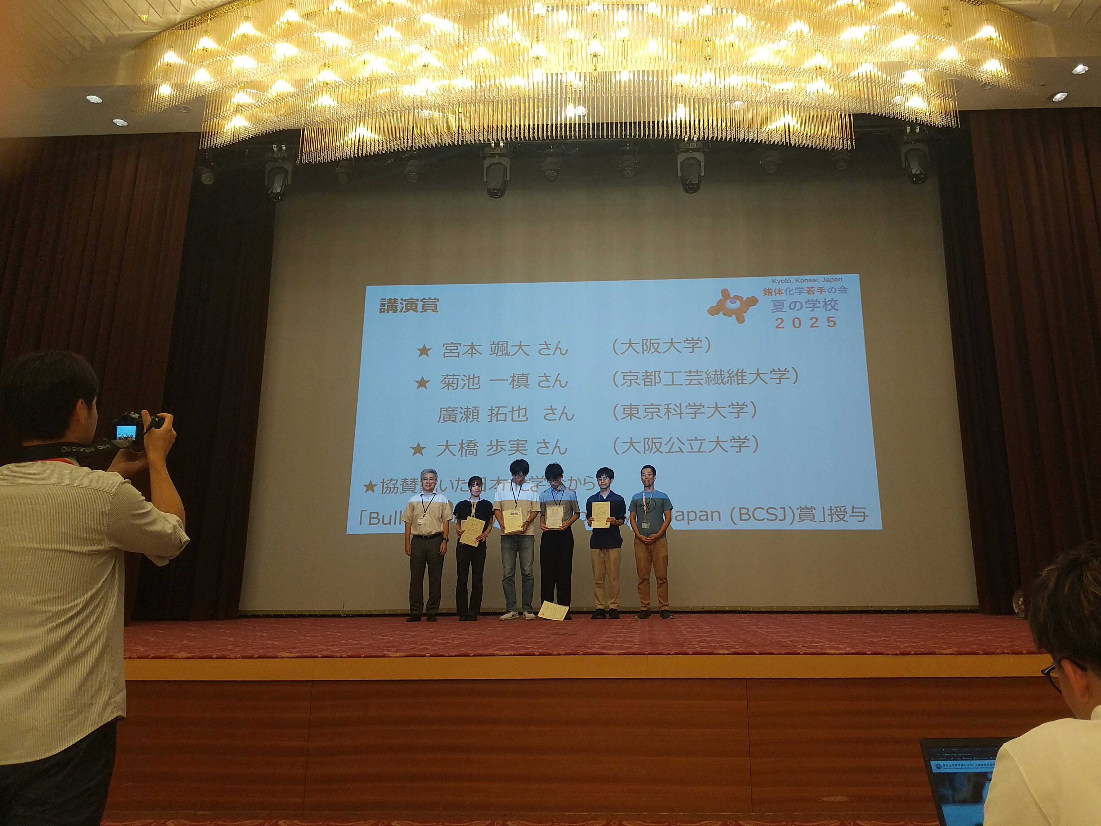 Hirose (M2), Kamiguchi (B4), Hirano (B4), Nishimura (B3) attended Wakate-no-kai for coordination chemistry to present their research. Hirose won an oral presentation award. We organized "subway seminar". (2025.08.29)